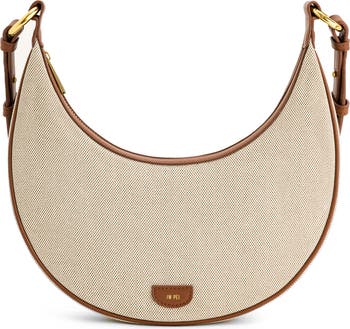 Polished hardware and a durable canvas exterior add modern intrigue to a crescent-shaped bag fitted with an adjustable shoulder strap for styling versatility.