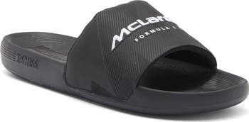 The iconic sports car brand makes its mark on the textured vamp of this slide sandal that's fitted with an anatomically contoured footbed for all-day comfort.