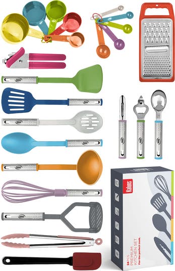 Measuring Cups and Spoons Solid and Slotted Spoon Solid and Slotted Turner Spatula, Tongs and Ice Cream Scoop, Potato Masher Soup Ladle, Whisk, Grater and Wine Opener/Product Type: Kitchen Equipment/Intended Use: Our kitchen utensil set is designed with the chef in mind! Featuring 24 pieces of high quality cooking tools, this set has everything you need. Made from stainless steel and nylon material these utensils are heat resistant up to 350 F/180. Safe to use on non stick surfaces, dishwasher safe and rust free. This set comes ready to gift in a beautiful box, no wrapping paper necessary!