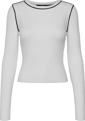 Contrast piping highlights the silhouette of this body-skimming rib knit sweater top.
