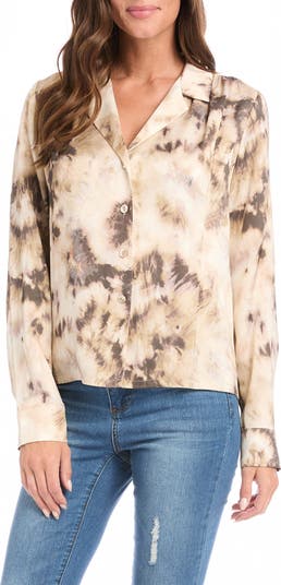 A cloudy tie-die print brings bold style to this chic notched-collar shirt cut from a lightweight woven fabric.