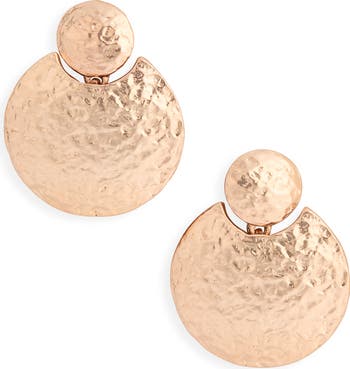 A hammered finish catches light at each and every angle in these circular drops plated in romantic rose gold.