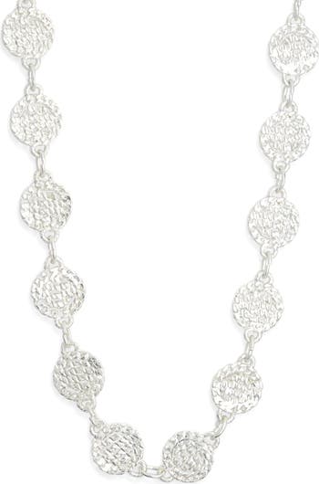 Easy to wear solo or layered, this icy silvertone-plated necklace boasts polished coins in an open-artwork design.