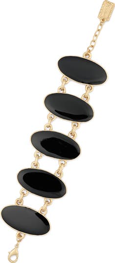 Inky-black enamel fills the space of the oval-shaped charms strung on a delicate chain bracelet complete with high-polish shine.