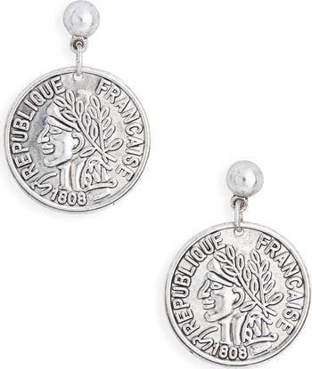 Show off vintage-inspired shine with these French coin–embossed drop earrings featuring a lightly burnished finish.