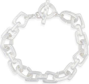 Geometric links add contemporary shine to this toggle-clasp bracelet enhanced by a hammered texture.