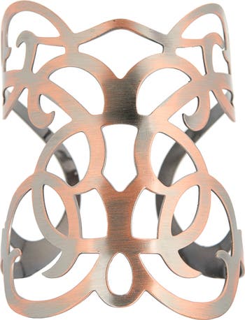 A geometric cutout makes a sophisticated statement on this gleaming rose-gold plated cuff.