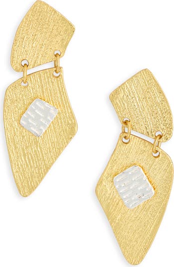 Intricately textured geometric discs catch the light on these statement drop earrings boasting a bold two-tone finish.