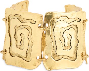 Free-form edges define spiral accents that define each square of a polished bracelet warmly plated in 24-karat gold.