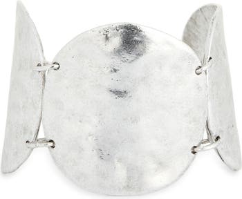 A hammered finish catches light at each and every angle in this stretch bracelet boasting icy discs.
