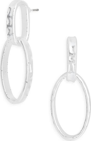 Embrace modern elegance with these drop hoop earrings, featuring two interlocking links that gleam in icy silvertone plate, that catches light beautifully.