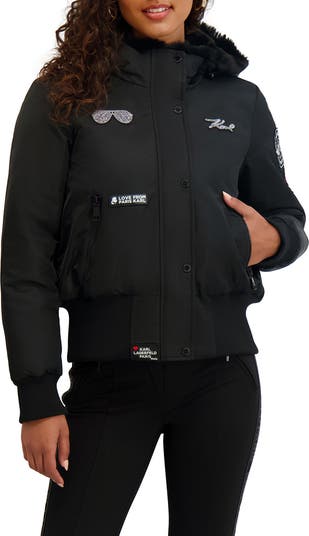 Karl's iconic silhouette and branded patchwork detailing brings heritage appeal to a nylon jacket topped by a faux-fur-trimmed hood for extra warmth as the temp drops.