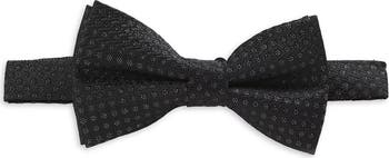 Finish your well-dressed look in a dash with this pre-tied bow crafted from satin with a floral weave.