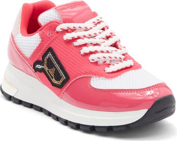 Lagerfeld shines in rhinestones at the sidewall of this sporty sneaker detailed with metallic and iridescent accents.
