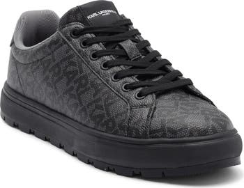 A repeating logo patterns a low-profile sneaker that combines branded charm with everyday appeal.