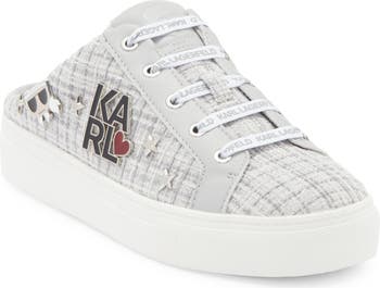 Logo-printed laces and iconic hardware put a signature stamp on this sneaker-inspired mule topped with a tweed upper.