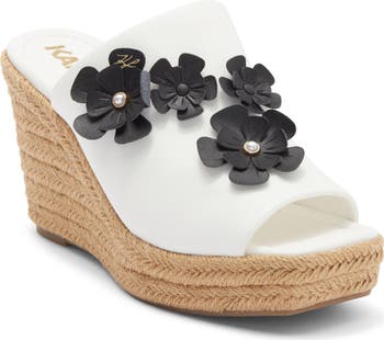 Dimensional flowers and pearly studs bring instant charm to this espadrille-inspired sandal lifted by a jute-wrapped platform and integrated wedge heel.