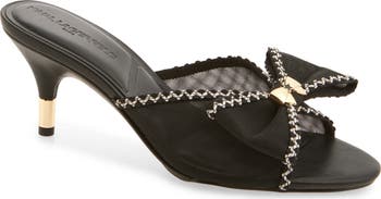 An oversized bow centered with high-polish hardware also shaped like a bow doubles up the sweetness of this slide sandal lifted by a metal-detailed stiletto.