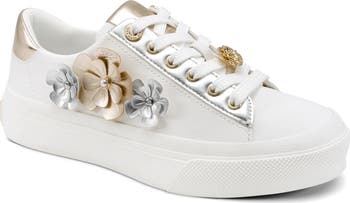 Pretty blooms and metallic details draw the eye to a casual low-top sneaker complete with a logo plaque at the collar for heritage appeal.