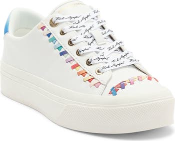 Logo-printed laces and rainbow grosgrain-ribbon trim bring signature flair to this soft leather sneaker boosted by a white platform sole.