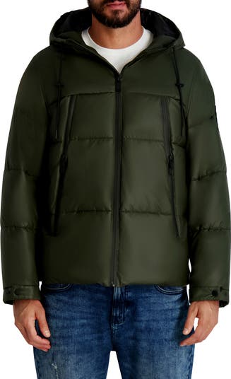 Brave the cold in this quilted puffer jacket featuring a hood and roomy pockets.