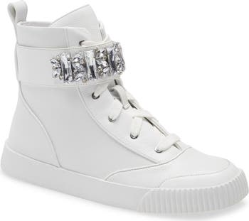 A strap embellished with sparkling crystals adds a flash of glamour to this street-chic high-top sneaker.