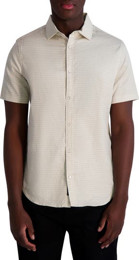 A repeating Karltooth pattern dominates a stretch-enhanced cotton shirt framed by a breezy short sleeves.