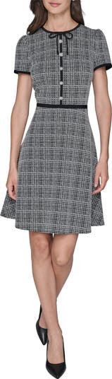 This short-sleeve jacquard knit dress features a charming bow at the neckline, a faux button yoke for a vintage-inspired touch and an A-line skirt that adds graceful movement to its structured silhouette.