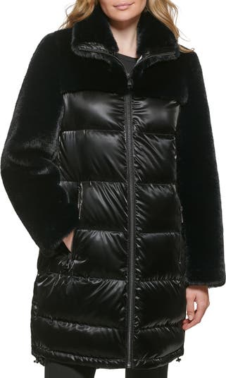 Stay warm in style in this water-resistant puffer jacket that's insulated with cozy down and feather fill and features faux fur on the sleeves and collar.