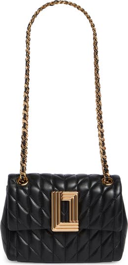Gleaming logo hardware highlights the quilted leather exterior of a convertible crossbody outfitted with a pull-through chain strap for versatile wear.