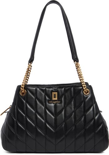 Gleaming logo hardware highlights the quilted leather exterior of a versatile carryall outfitted with a pull-through chain strap.