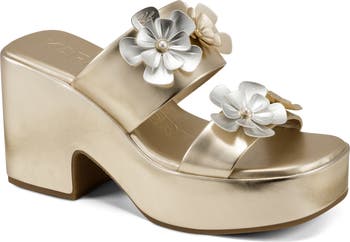 Pretty blooms add a dose of sweetness to the wide, metallic straps that secure your foot in a slide sandal lofted by a chunky heel and platform.
