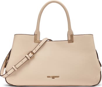Gleaming logo hardware highlights the smooth leather exterior of a structured satchel that can be carried by the top handles or crossbody strap for versatile appeal.