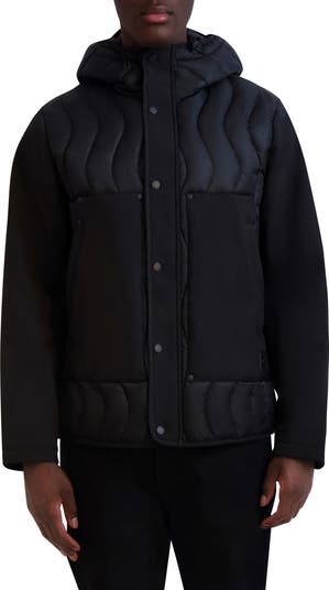 A fixed hood punctuates this streamlined, mixed-media jacket with an extra element of timeless sophistication.