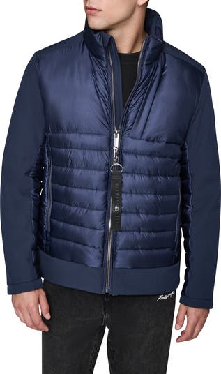 Keep out the cold with this mixed-media jacket featuring a channel-quilted core and stretch-knit panels along the sleeves and upper back.