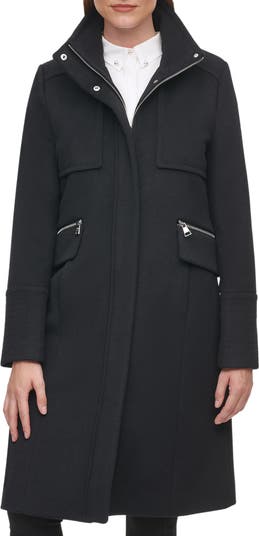 Zipper and flap pockets bring an officer-inspired look to this timeless coat crafted from a wool blend.