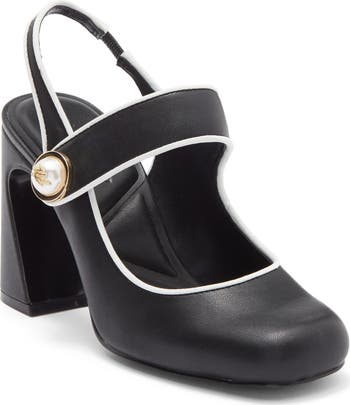 Revel in the retro look of this chunky slingback pump enhanced by a sculptural heel, contrast trim and a faux-pearl buckle.