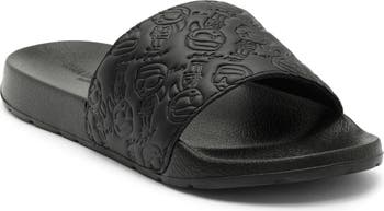 Cartoon-versions of Karl are embossed along the vamp strap of this warm-weather-ready sandal fitted with a cushioned insole.