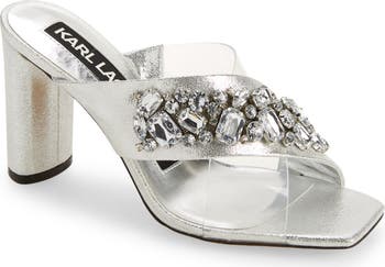 Jewel-embellished and transparent straps crisscross over the vamp of a glam sandal framed by a square toe and cylindrical block heel.
