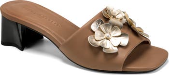 3D metallic flowers centered with faux pearls put a resort-perfect spin on this slide sandal lifted by a geometric block heel.