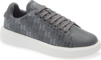 Diagonal monogram logos sweep across this low‑profile sneaker made with a faux‑leather upper.