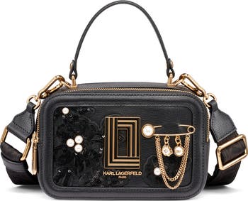 Sequin appliqués, faux pearls and gleaming hardware glam up this compact crossbody bag boasting an exterior phone pocket and two zip compartments.