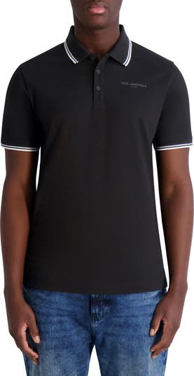 A striped collar and cuffs frame a comfortable stretch-cotton polo that offers signature style with a chest logo print.