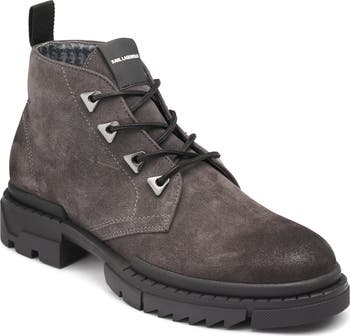 A heavily lugged sole lends a utilitarian update to a classic chukka boot with stretchy gore insets at each side.