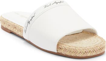 Scripted branding neatly outlines the faux-leather vamp of an espadrille sandal done with an easy on-off profile that brings unmistakable summer style to warm-weather looks.