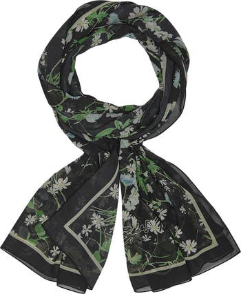 A garden of blooms lends sweet style points to a wrap-styled scarf cut from airy chiffon that acts as a delicate layer over everyday looks.