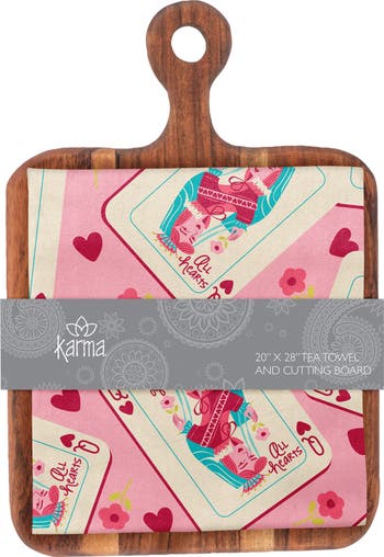 Perfect for gifting or upgrading your kitchen essentials, this Queen of Hearts-inspired tea towel and wooden cutting board set brings a stylish blend of color and functionality to any home.