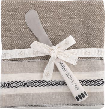 Perfect for gifting or elevating your next event, this patterned cotton tea towel and stainless steel spreader knife offer the perfect blend of contemporary charm and functionality to your kitchen.