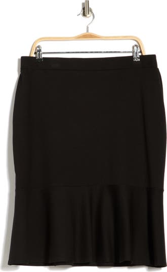 Exude polished style in this pull-on crepe pencil skirt edged by a fluttery flounced hem.