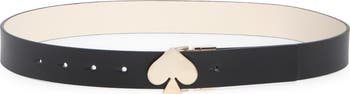 A gleaming spade buckle adds a polished finishing touch to a sleek leather belt that reverses for styling versatility.